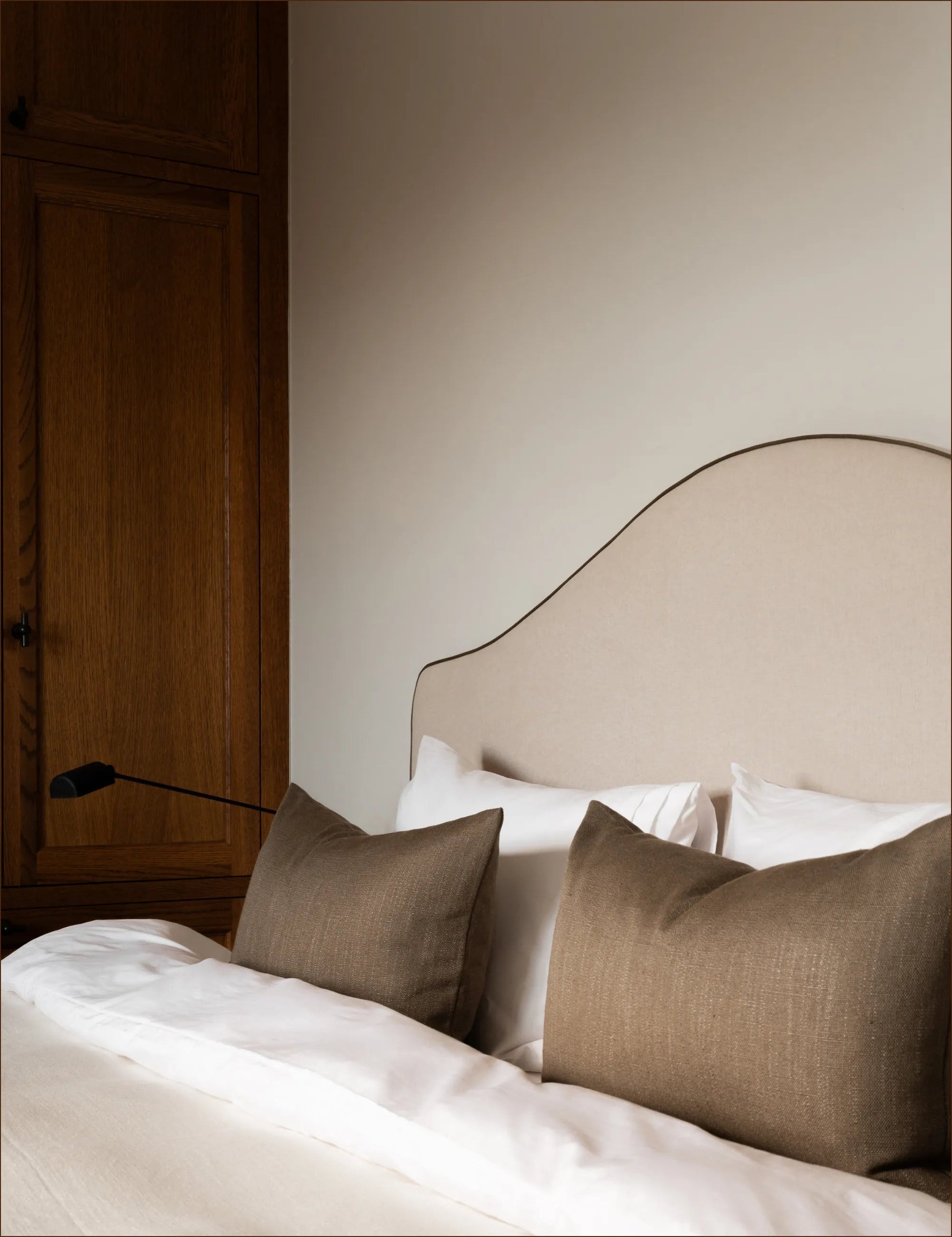 Headboard Type: Oversized, wall-mounted vertical panel headboard with piped edge detailing